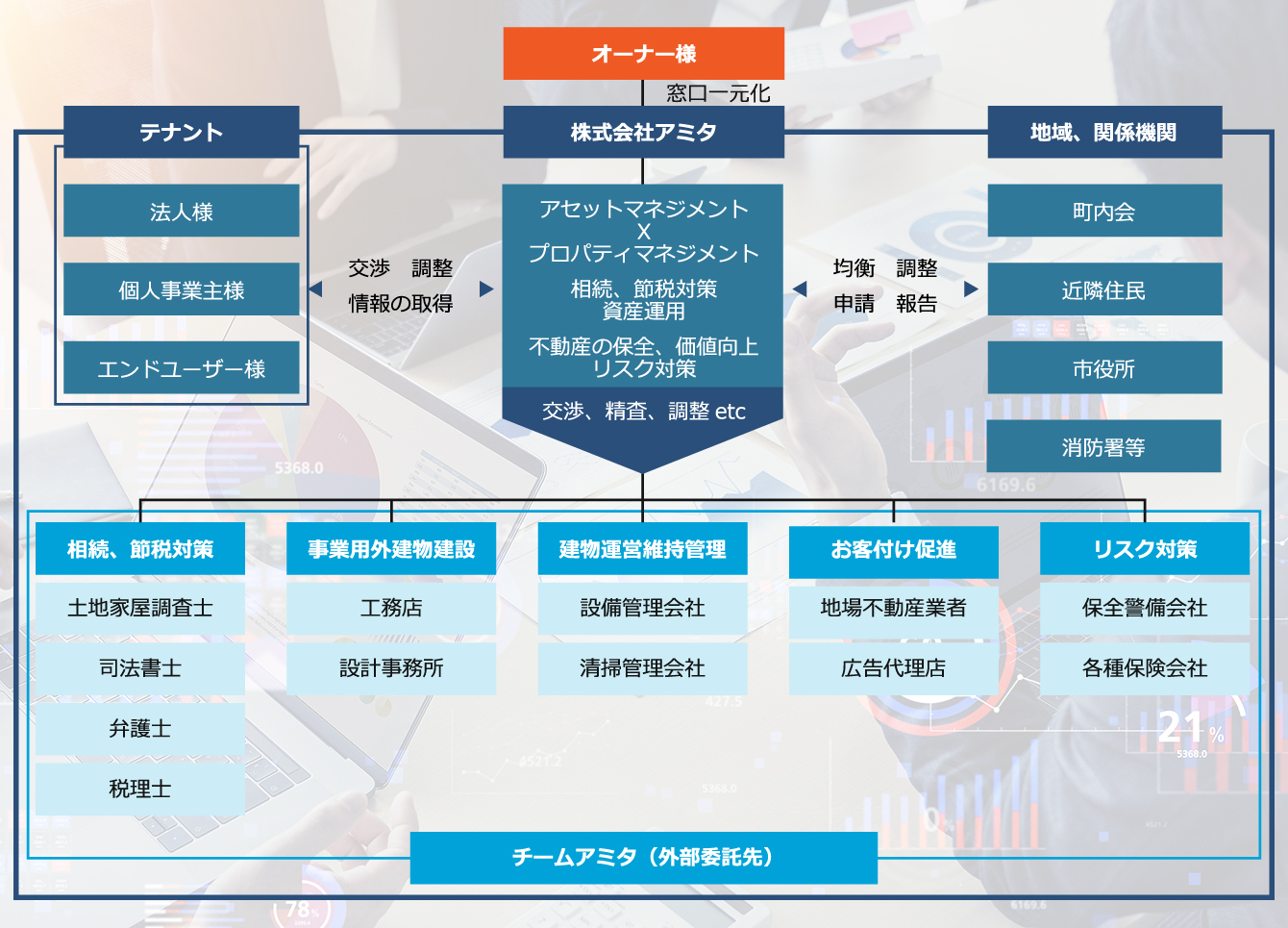 当社は専門の会社や士業資格者と提携し、幅広いチームでオーナ様の課題解決を行っています。
